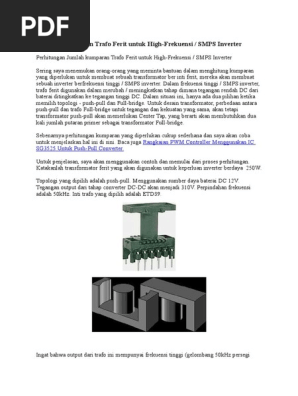 Jika memungkinkan, sebaiknya merk jepang atau buatan eropa. Untuk sekedar mencoba apakah semua yang kita buat dari awal bekerja dengan baik atau tidak maka rangkaian tidak perlu spek tinggi cukup menggunakan trafo kecil dan mosfet dengan daya kecil kita akan melihat bentuk. Untuk rt=15k dan ct=470pf kalau secara rumus frequensinya sekitar 90khz. Cukup input al dan jumlah lilitan, maka akan didapatkan nilai induktansi yang diinginkan. Bmax is maximum flux density. Transformator inti ferit dipakai pada rangkaian frekuensi menengah trafo inti ferit, banyak dipakai sebagai alat interface rangkaian matching impedansi dalam rangkaian elektronik frekuensi menengah. Parameter yang saya pakai untuk menghitung np (lilitan primer) adalah seperti ini: Cara membuat trafo ferit kecil dari bekas trafo inverter dc to dc. Kalau cek di c dan e pada tr belum memuaskan, bisa pakai perhitungan penguatan dari trafo ferit. Misalkan kita menginginkan hilangnya daya maksimum pada inti 100 kw / m³, yang sama dengan 100 mw / cm³, saya menunjukkan nilai ini dengan garis merah. Rumus hukum faraday adalah sebagai berikut: Rumus ferit xxfe2o4 dimana xx mewakili berbagai logam. Bahan ini serupa bubuk besi direkatkan dengan pengikat.